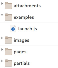 The examples directory contains non-AsciiDoc file types, such as source code or sample data sets. An example is inserted into a page using the AsciiDoc include directive and the example’s resource ID.